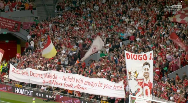 It is the first competitive fixture at Anfield that Liverpool have played since Jota’s passing, and tributes have been planned. And they were carried out prior to kick-off, with the first being an emotional rendition of the club’s famous anthem: You’ll Never Walk Alone.